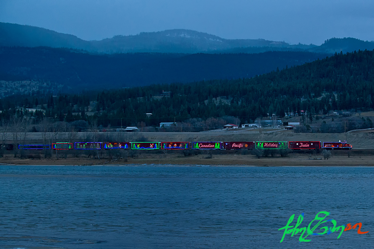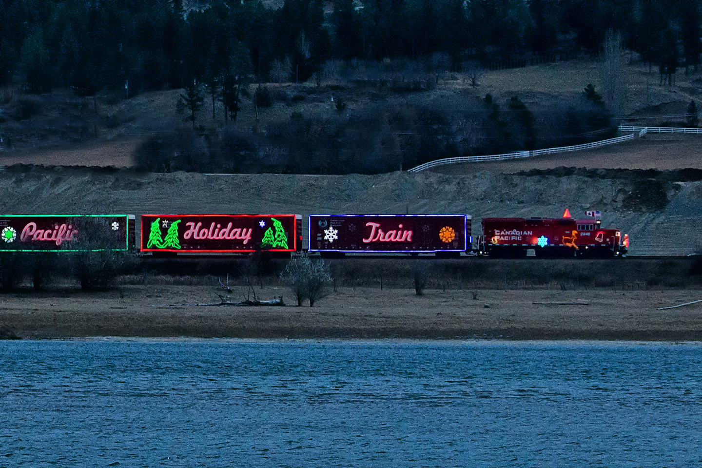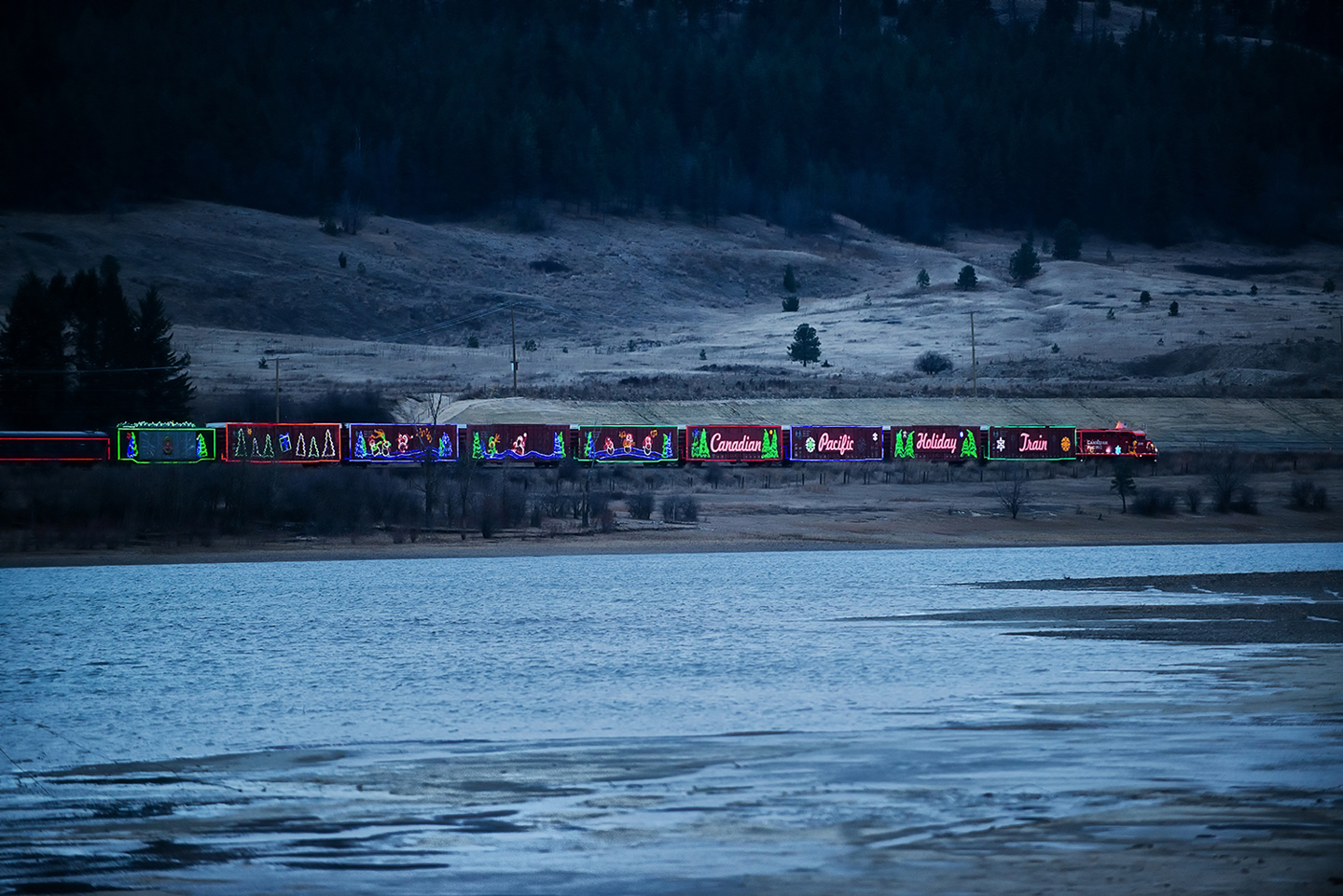 As I suggested when I wrote about photographing the CP Holiday Train, begin by choosing the location well in advance, before it gets dark, and prepare to begin when the electric lights are first turned on, when there is still some light in the sky, yet dark enough for the lights to be bright.