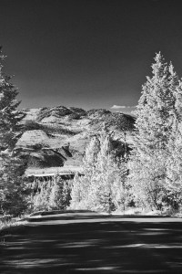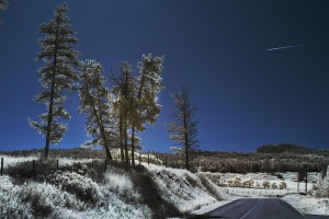 The church was an excellent subject. Although not very distinctive with it’s non-descript wooden walls. But there are trees near it and hills in the background and I wanted to work with the IR to get strong contrast, luminous trees, a black sky and the white window edging and stark white cross would glow with the reflecting infrared conversion.